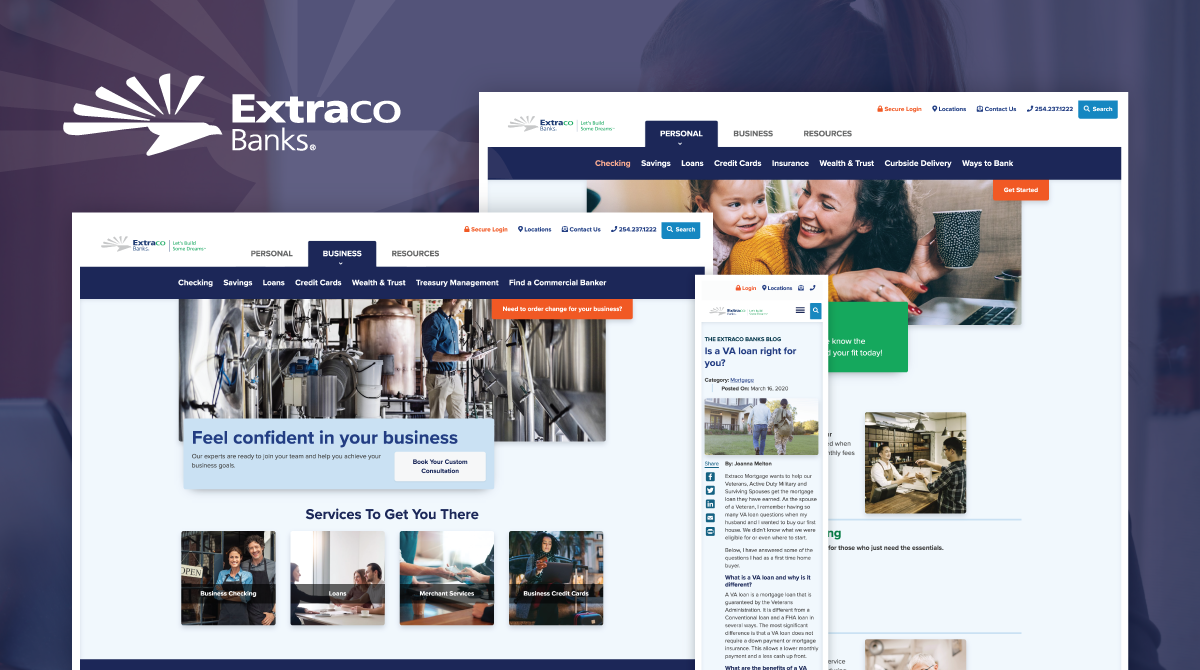 Extraco Banks website exemplifies consistent branding across their website and programs as color scheme, messaging, and fonts are carefully curated throughout the website.